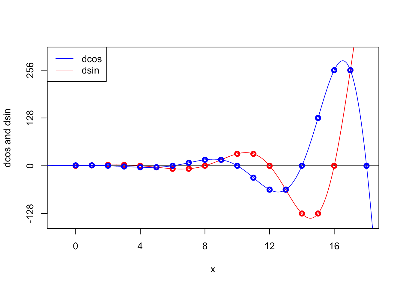 - dcos and dsin both have sort-of-periodic behaviour with “period” $8 = 2\times 4$